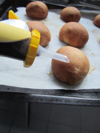 Alle trockenen Zutaten in eine Schüssel geben und vermischen. Butter und Milch zugeben und zu einem glatten Teig verkneten. Die Schüssel zudecken und an einem warmen Ort ca. 1 ½ Stunden aufgehen lassen. Er sollte aufs doppelte Aufgehen. Aus dem Teig 8 Kugeln formen. (Ich habe sie abgewogen, damit sie alle gleich gross wurden.) Auf ein mit Backpapier belegtes Blech legen und nochmals zugedeckt für 45 Minuten aufgehen lassen. Den Backofen auf 160 Grad Umluft vorheizen. Die Teigkugeln mit der flüssigen Butter bestreichen und für 15 bis 20 Minuten backen.