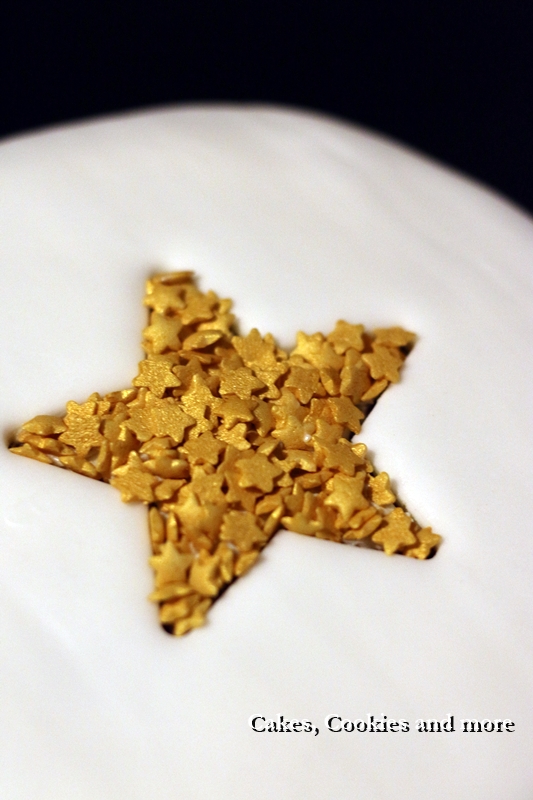 Den unteren Boden in den Tortenring legen und an den äusseren Rand einen Ring aus Buttercreme aufspritzen (und zwar so, dass später die Creme nicht mit dem Fondant in Berührung kommen kann). Die vorbereitete Creme einfüllen und den oberen Teil des Biskuits darauf geben. Die Torte für min. 4 Stunden in Kühlschrank stellen. Dann vorsichtig den Tortenring ablösen und die Torte mit Buttercreme einstreichen, so dass eine schön glatte Oberfläche entsteht. (Je sauberer das gearbeitet wird, desto weniger Hubel hat nachher die Fondantdecke) Die Torte nochmals für ca. 15 Minuten kühlstellen. Nun die Torte mit der Fondantdecke eindecken. Zur Verzierung mit einem Sternenausstecher, die Torte oben einstechen und den Fondantstern herausnehmen. Der so entstandene Stern mit Zuckerstreusel füllen.