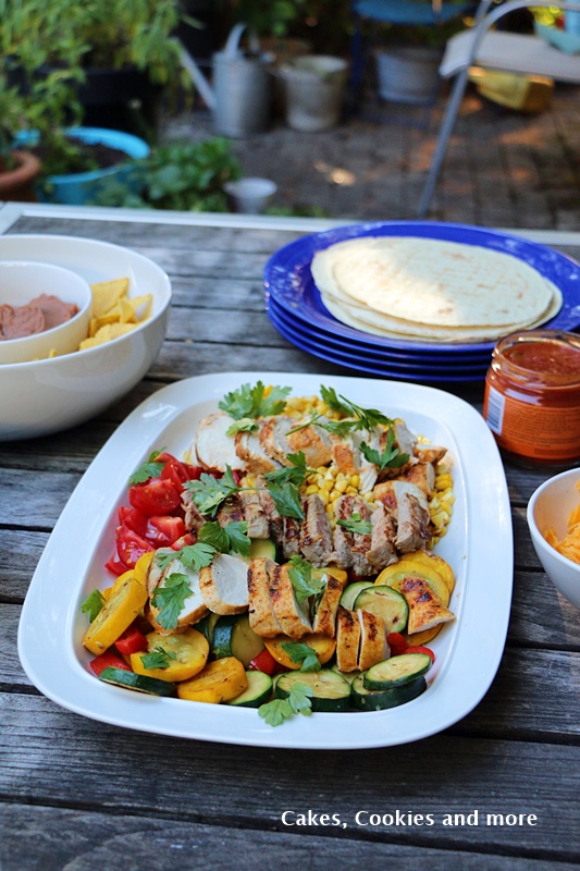 Gegrillte Fajitas, Refried Beans, Gucamole, Käse und Salsa dazu reichen und alles zusammen geniessen.
