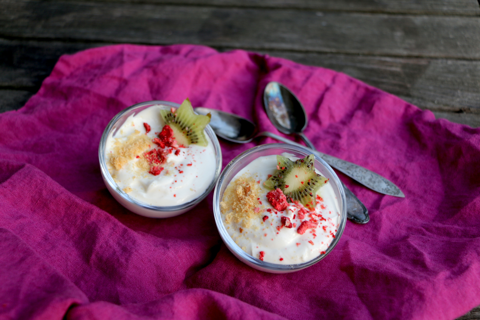 - Skyr und Frischkäse miteinander vermischen. Mit Vanille, Zitronensaft und Ahornsirup abschmecken. Auf 4 Schüsseln verteilen. Mit den Toppings belegen nach Lust dekorieren.