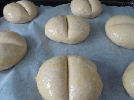 Alle trockenen Zutaten in eine Schüssel geben und vermischen. Butter und Milch zugeben und zu einem glatten Teig verkneten. Die Schüssel zudecken und an einem warmen Ort ca. 1 ½ Stunden aufgehen lassen. Er sollte aufs doppelte Aufgehen. Aus dem Teig 8 Kugeln formen. (Ich habe sie abgewogen, damit sie alle gleich gross wurden.) Auf ein mit Backpapier belegtes Blech legen und nochmals zugedeckt für 45 Minuten aufgehen lassen. Den Backofen auf 160 Grad Umluft vorheizen. Die Teigkugeln mit der flüssigen Butter bestreichen und für 15 bis 20 Minuten backen.